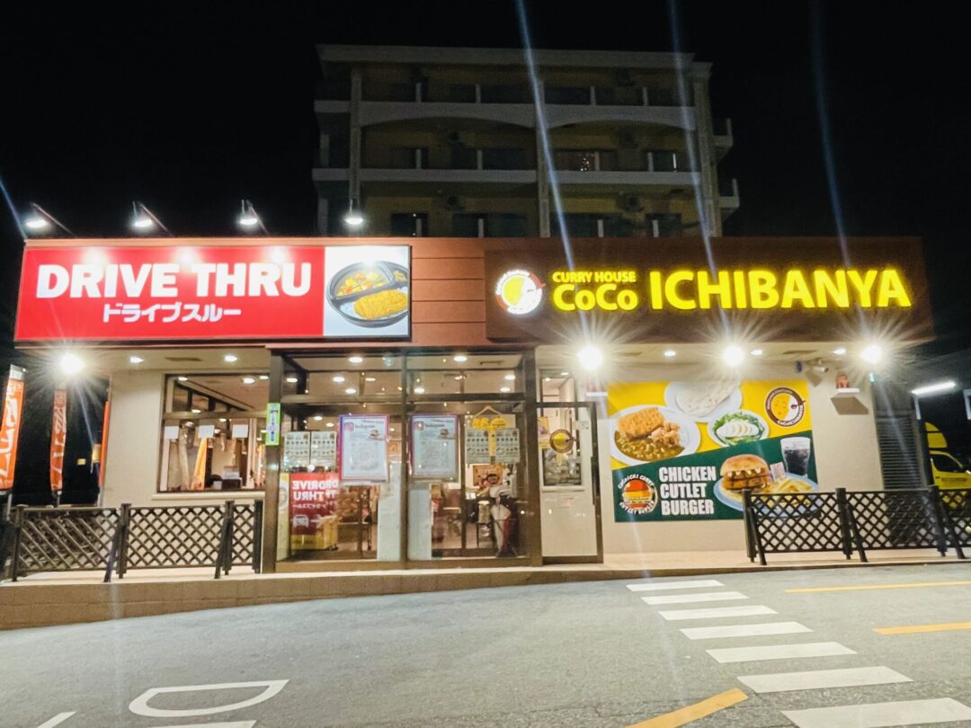 深夜の沖縄市北谷エリアをドライブ中、突然視界に飛び込んできたのは「CoCo壱番屋」の眩い看板!「えっ、ここが噂の…!?」と急ブレーキを踏みたくなる衝動を抑えつつ、駐車場に突入。英語表記のメニューボードが「Coco ICHIBABYA」と囁くように光り、「DRIVE THRUドライブスルー」の文字が!駐車場まで漂うスパイスの香りに、胃袋が早くも雄叫びを上げます。