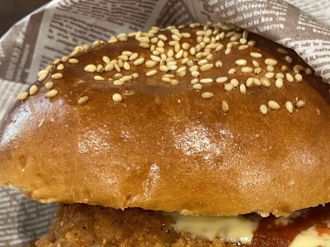 表面はこんがり、中はふわふわパンは黄金色、中からは2枚の 大きなチキンカツがこちらを白さがのぞく。『ガブリ!』とした瞬間──柔らかな肉汁が迸るほどのジューシーさ!