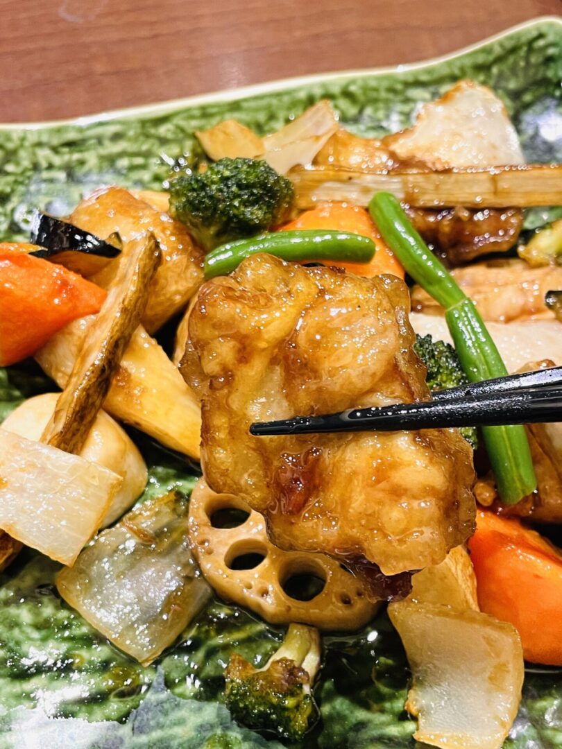 衣のハードな歯ごたえを突破した瞬間、豚の脂がどっと溢れ出す。 鶏にはない暴力的なまでの旨味。そこに濃厚な黒酢あんが絡みつき、脂の甘みを極限まで引き立てる。 口の中が「旨味の洪水」だ。社長の前でなければ、唸り声を上げていたかもしれない。