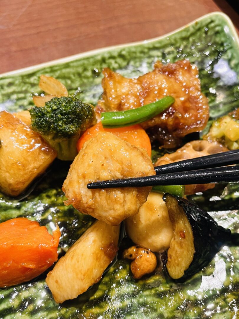 運ばれてきた膳を見て、俺は思わず背筋を正した。 皿の上で妖艶に黒光りする「黒酢あん」の海。その中で、素揚げされた野菜と肉たちが、まるで俺たちの揺るがない信念のように堂々と鎮座している。 立ち昇る湯気。鼻腔をくすぐる酸味。これぞ大戸屋の黒酢の香り。社長との会話の合間に、俺はこの黒き宝石たちへ箸を伸ばす