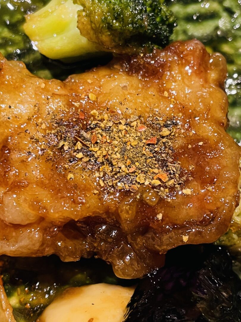 パラパラと黒い粉雪を振りかける。 再び肉を口へ……世界が変わった。 柚子と大葉の鋭い香りと痺れが、甘美な黒酢あんを一瞬にして「キレのある大人のソース」へと昇華させる。重厚さが軽さに変わり、研ぎ澄まされた旨味だけが残る。