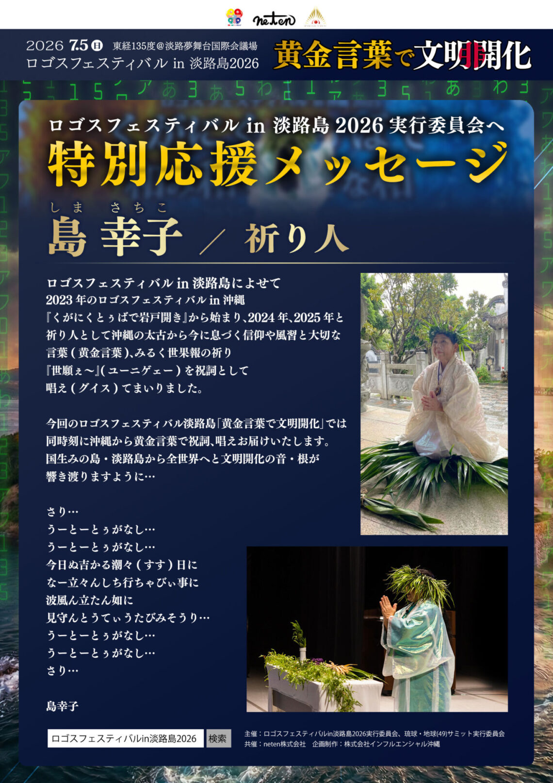メッセージをお寄せくださったのは、2023年に沖縄で開催された「ロゴスフェスティバルin沖縄『くがにくとぅばで岩戸開き』」から、2024年、2025年と連続して「祈り人」としてご登壇されている島幸子氏です。